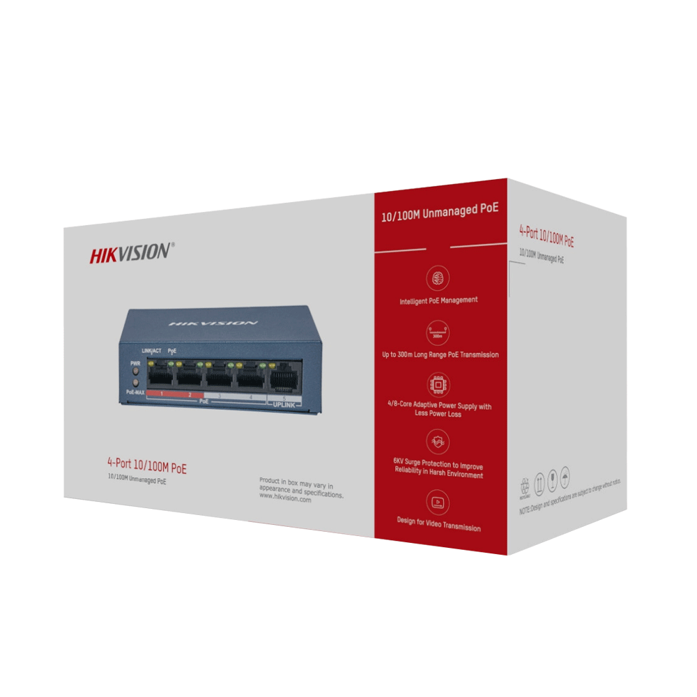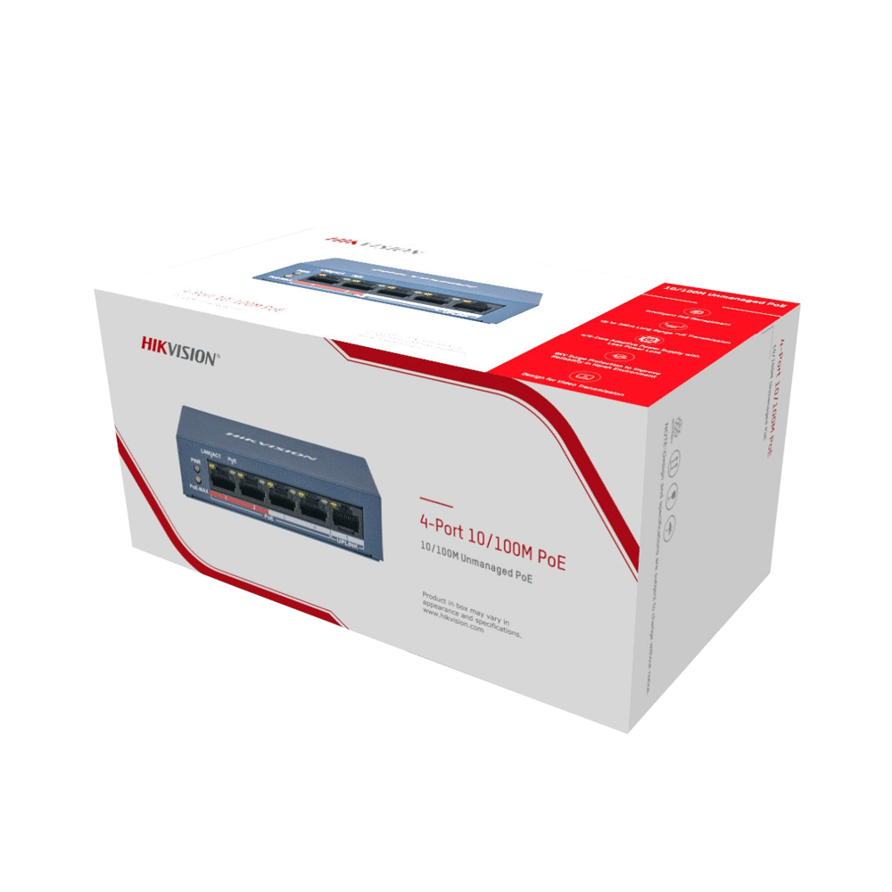 سوییچ DS-3E0105P-E/M دارای 4 پورت PoE با سرعت (10/100 Mbps) است که می‌تواند برق لازم دوربین‌های IP را از طریق همان کابل شبکه بدون نیاز به آداپتور جداگانه فراهم کند.